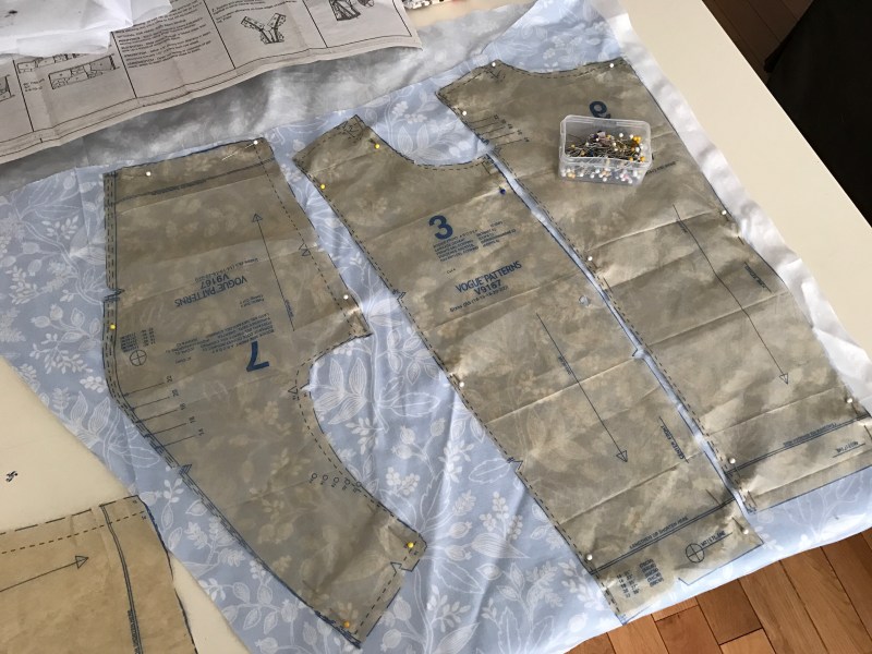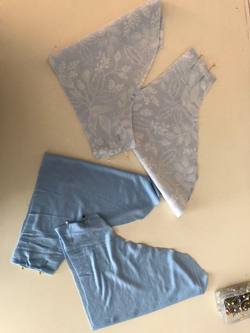 When it came time to get to the sleeves, I realized I needed to cut four of the main fabric… and I had used it for the lining! A little hunting around and I found this light blue t-shirt in my giveaway pile. This picture makes it look a lot darker than the fabric but in person it’s not quite so drastic.
