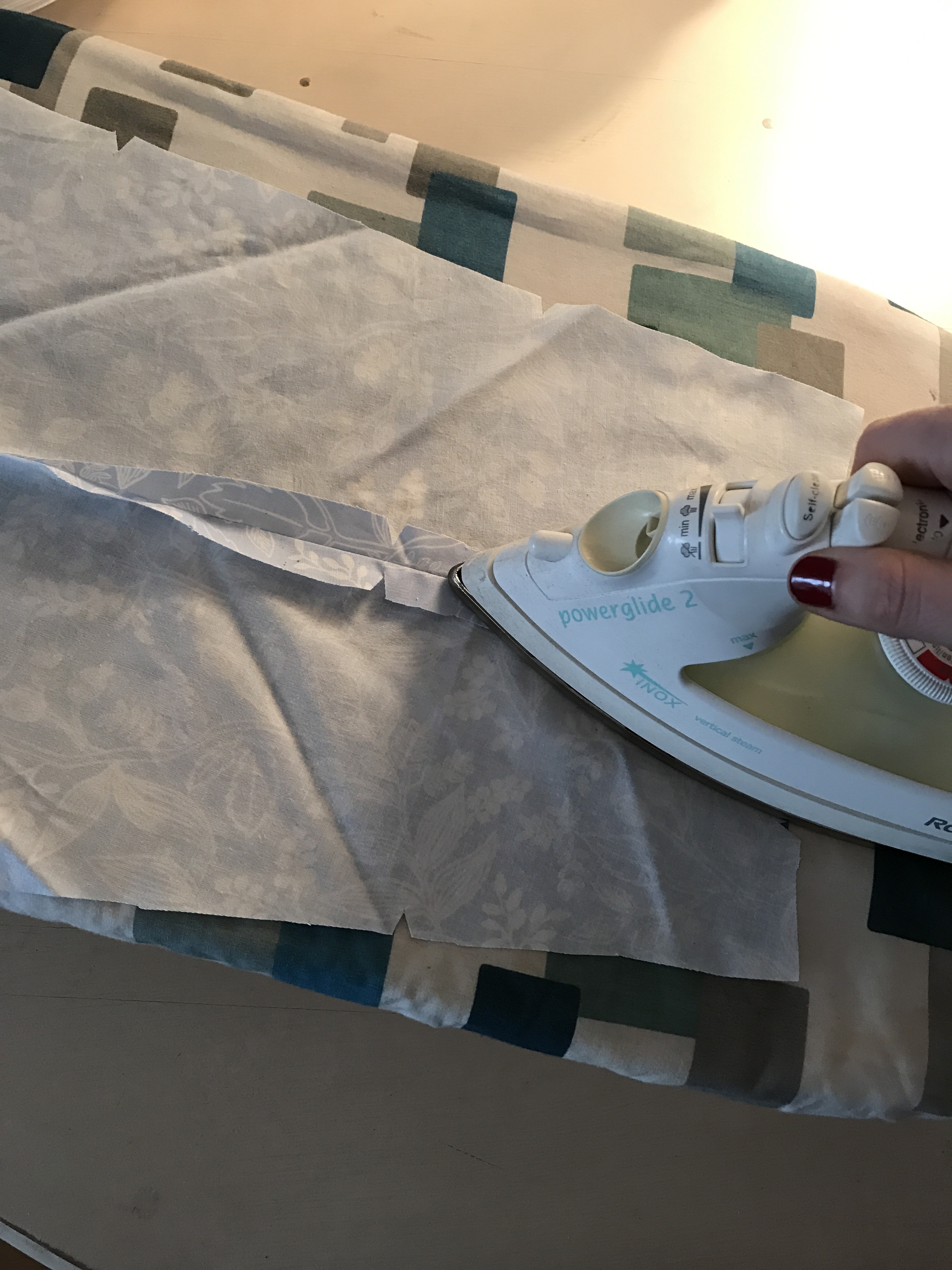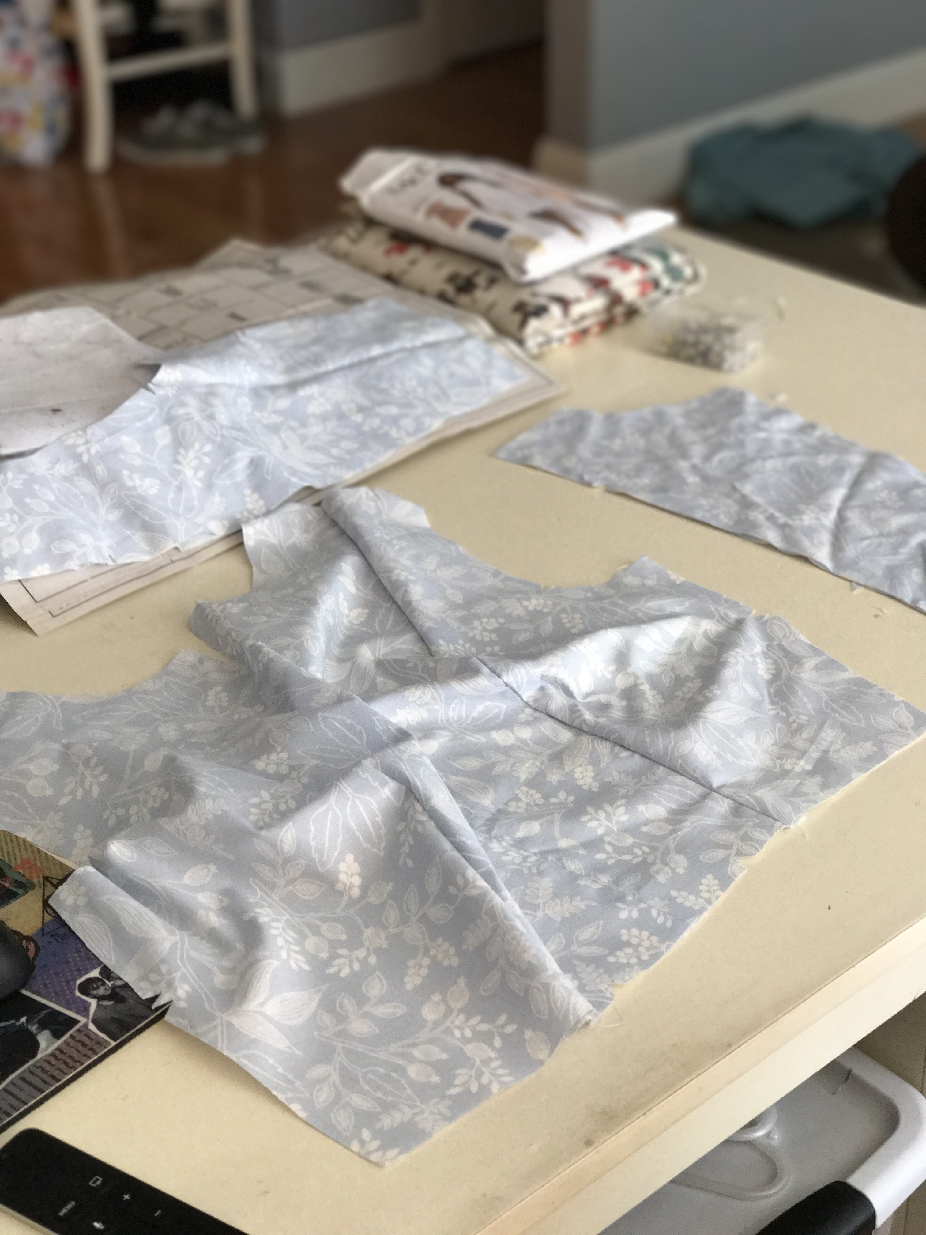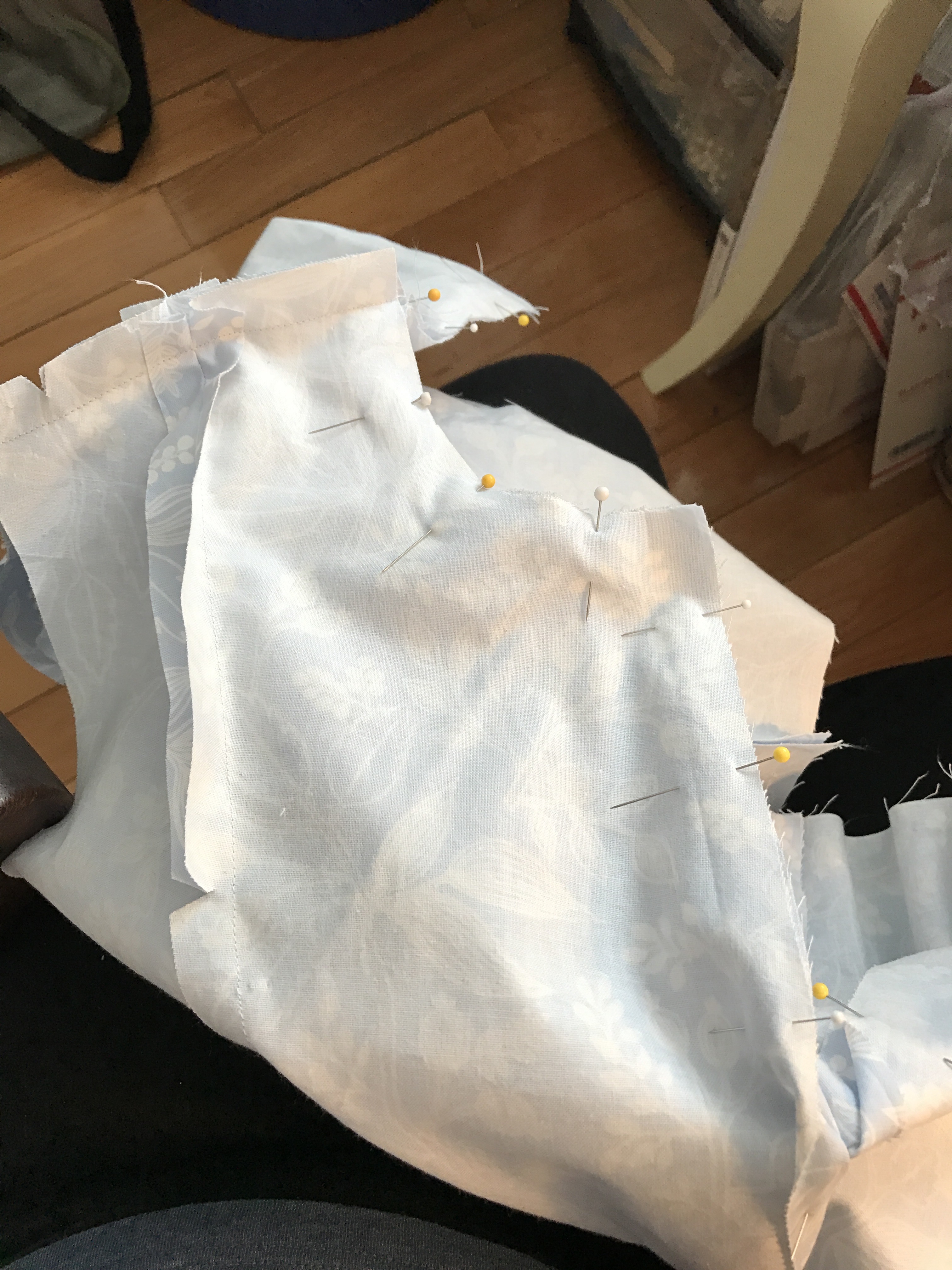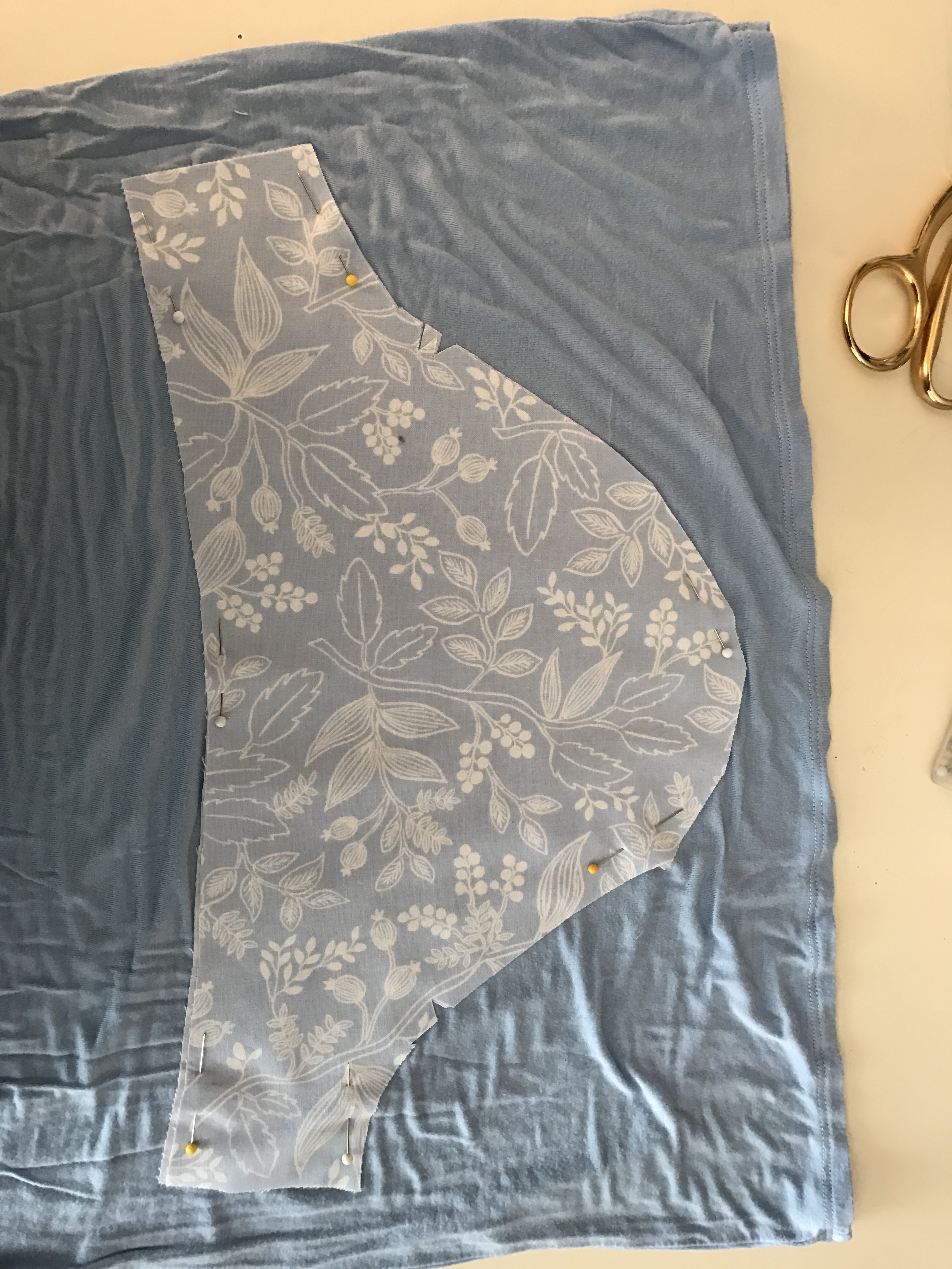 When it came time to get to the sleeves, I realized I needed to cut four of the main fabric… and I had used it for the lining! A little hunting around and I found this light blue t-shirt in my giveaway pile. This picture makes it look a lot darker than the fabric but in person it’s not quite so drastic.