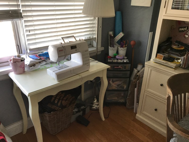First off, here’s my revamped sewing area. I realize without a before picture this doesn’t have all that much impact but picture giant Tupperware boxes in the corner to the right of the table and piles of projects on top of that. They were moved to under my desk, where they are still piled but completely out of site and don’t spoil the aesthetic of the rest of the space.