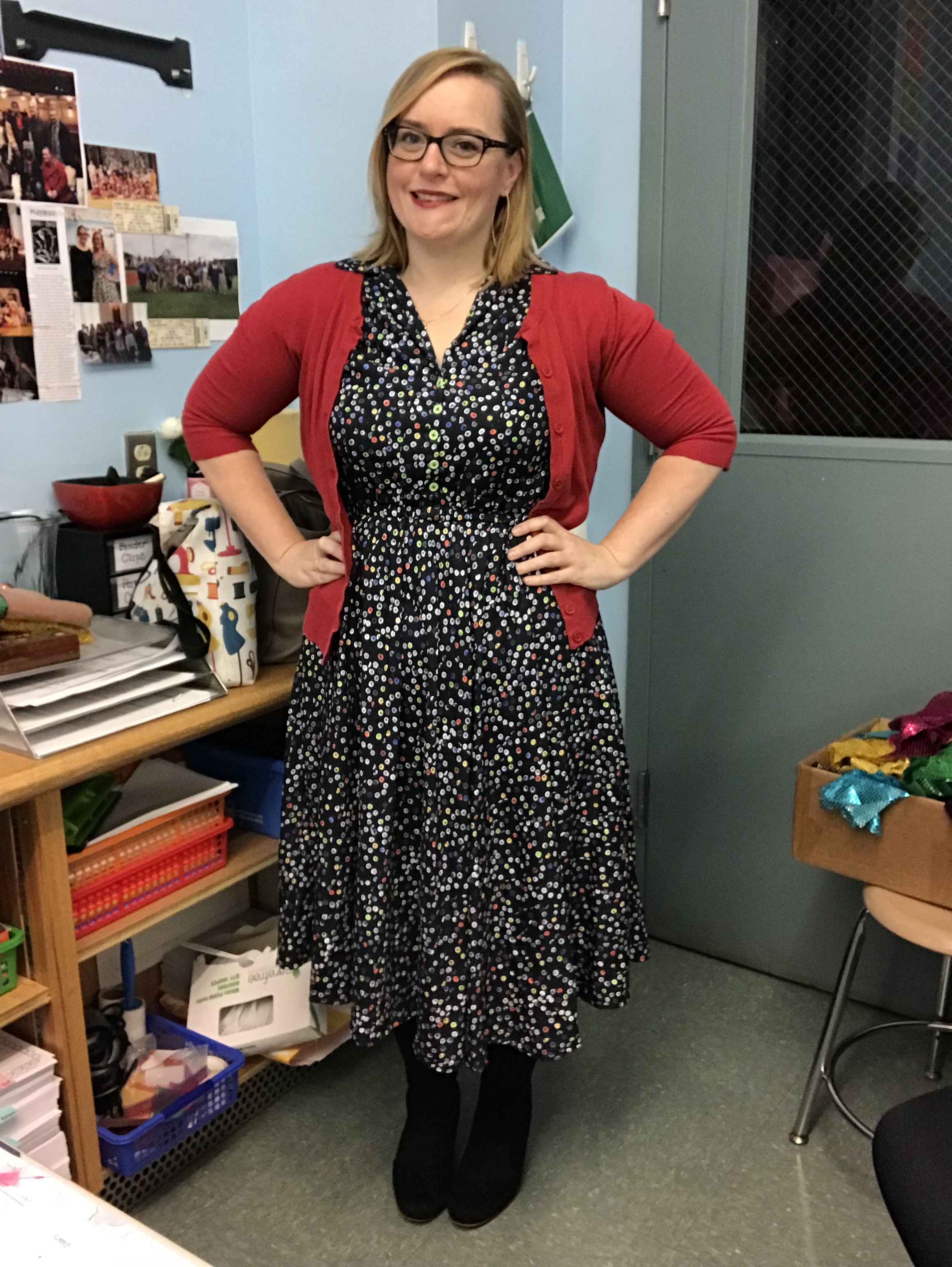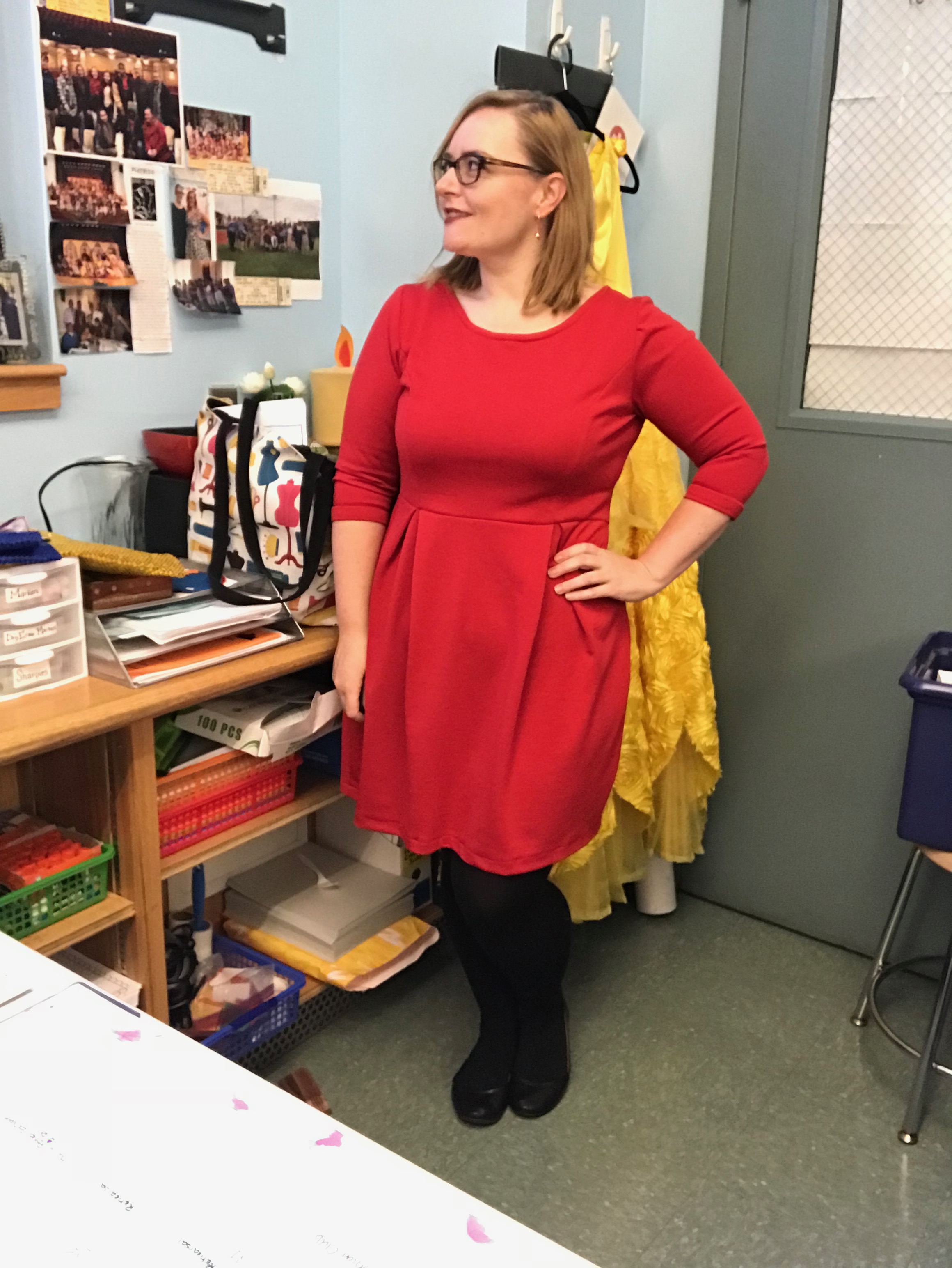 In addition to being an extremely easy make, made easier by the video instructions that came with the class, it was also super comfy! The version you see in red is a Ponte di Roma, and the version on the right is a lightweight jersey in multi-colored polka dots. I love wearing them both. They are perfect work dresses, especially for the chillier winter months. The polka dot one was also worn to my family’s Fake Christmas celebration as well as my holiday party for work.