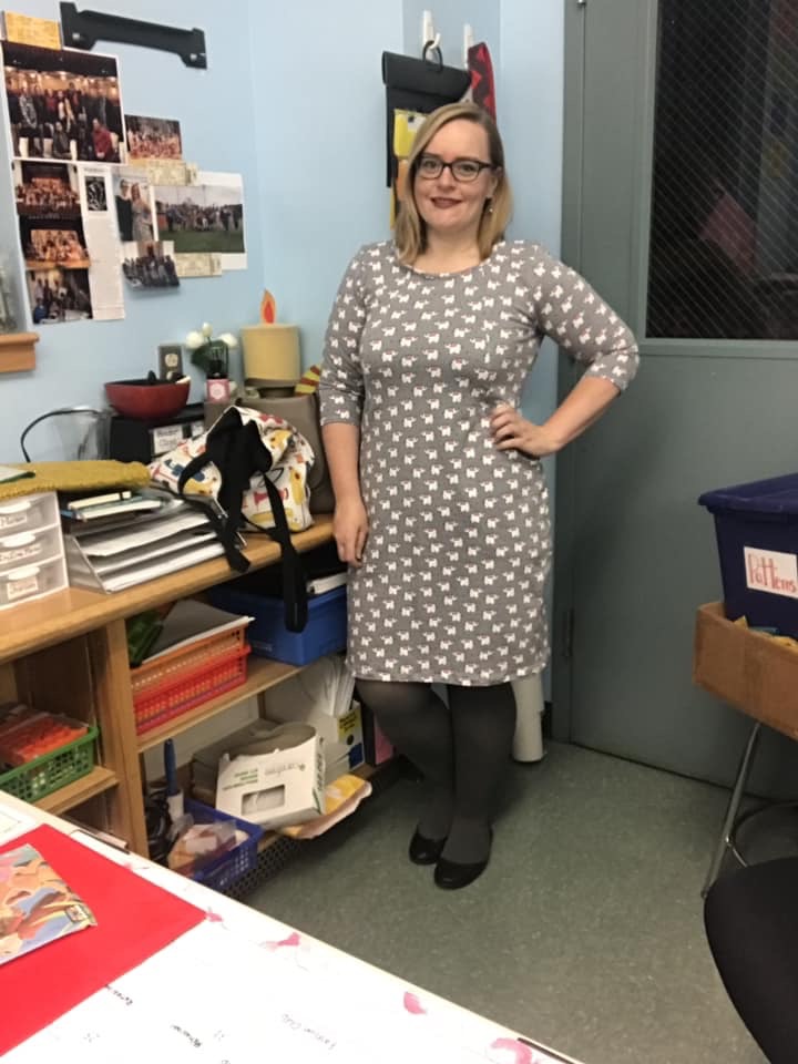 Finally, we have the Heather Dress, another one that I didn’t think would work well with my body shape, but also one that I felt I needed to try. It’s meant for a knit fabric, and so I chose an adorable French terry with a little origami elephant print that I got on sale. It has some imperfections (ones that you cannot likely see in the photo), such as a collar that doesn’t stay down on one side because I neglected to stretch it out when I was sewing it down. Even so, it’s perfectly wearable and, because it’s a knit, extremely comfy and cozy!