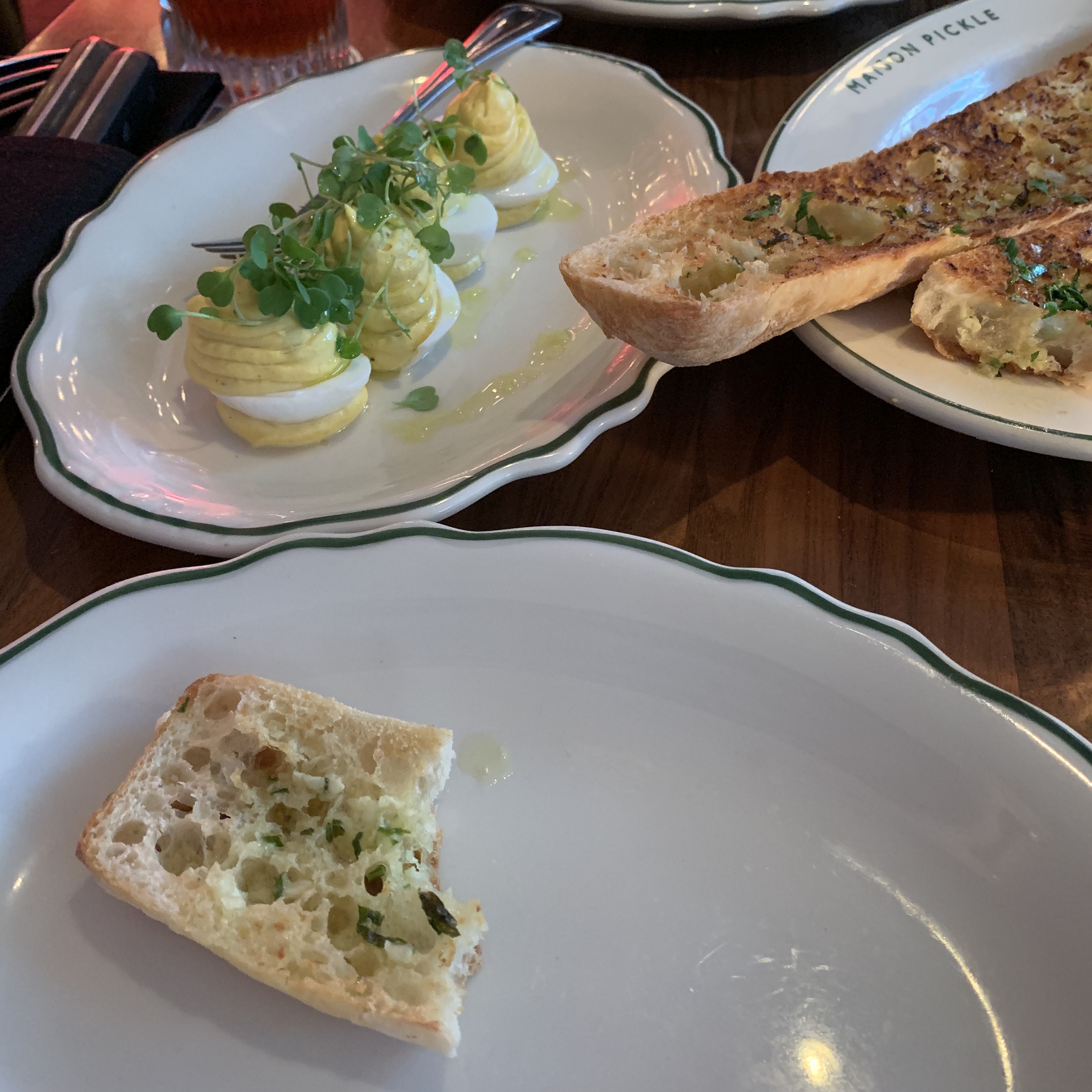 For appetizers we tried the garlic bread and the deviled eggs. The restaurant makes their own bread in house, so any dish that has bread involved is extra delightful because of that. The garlic bread was awesome (I took some of it home to have with eggs the next morning which I highly recommend doing), and the deviled eggs were good too. I wouldn’t say they were the greatest deviled eggs ever, but definitely worth trying.