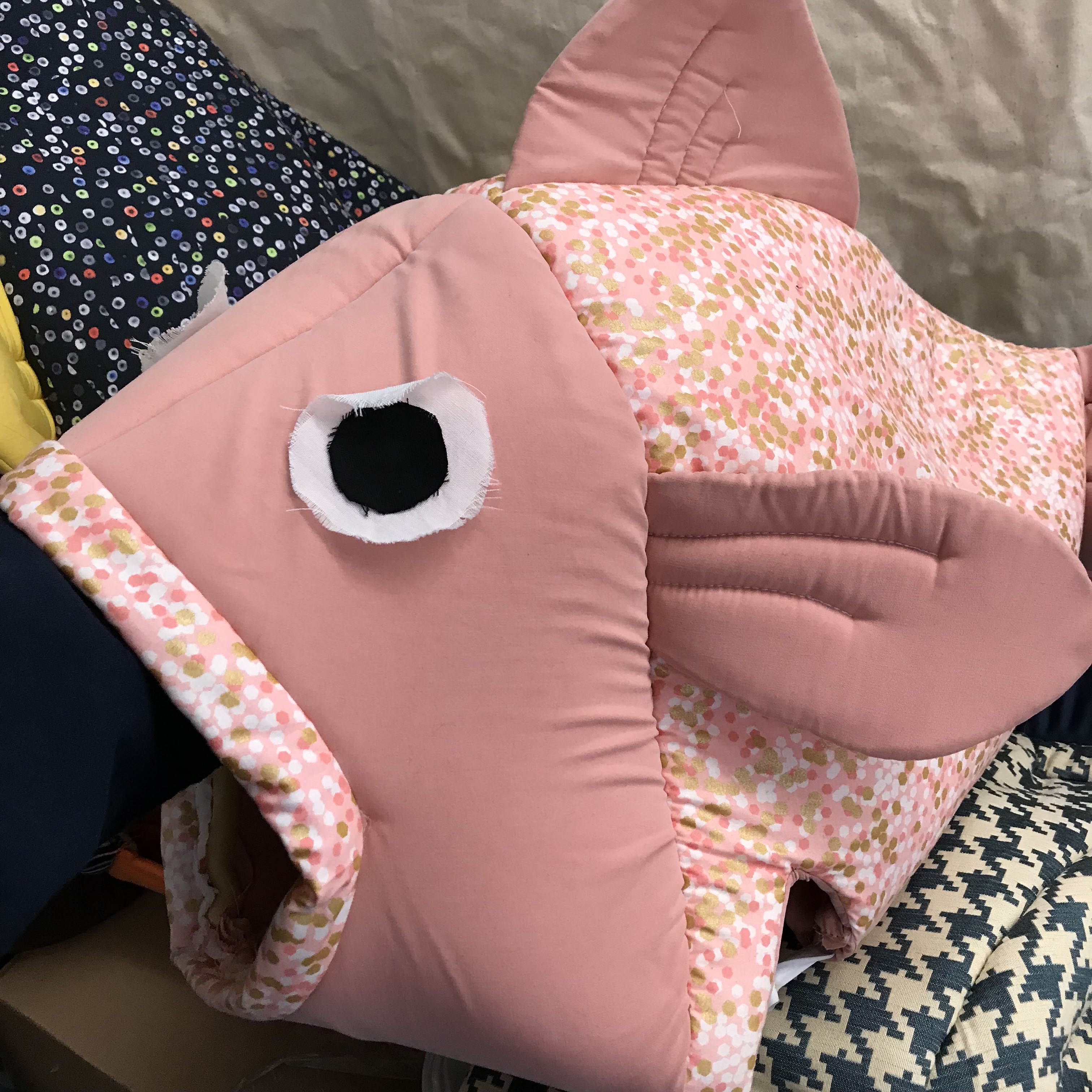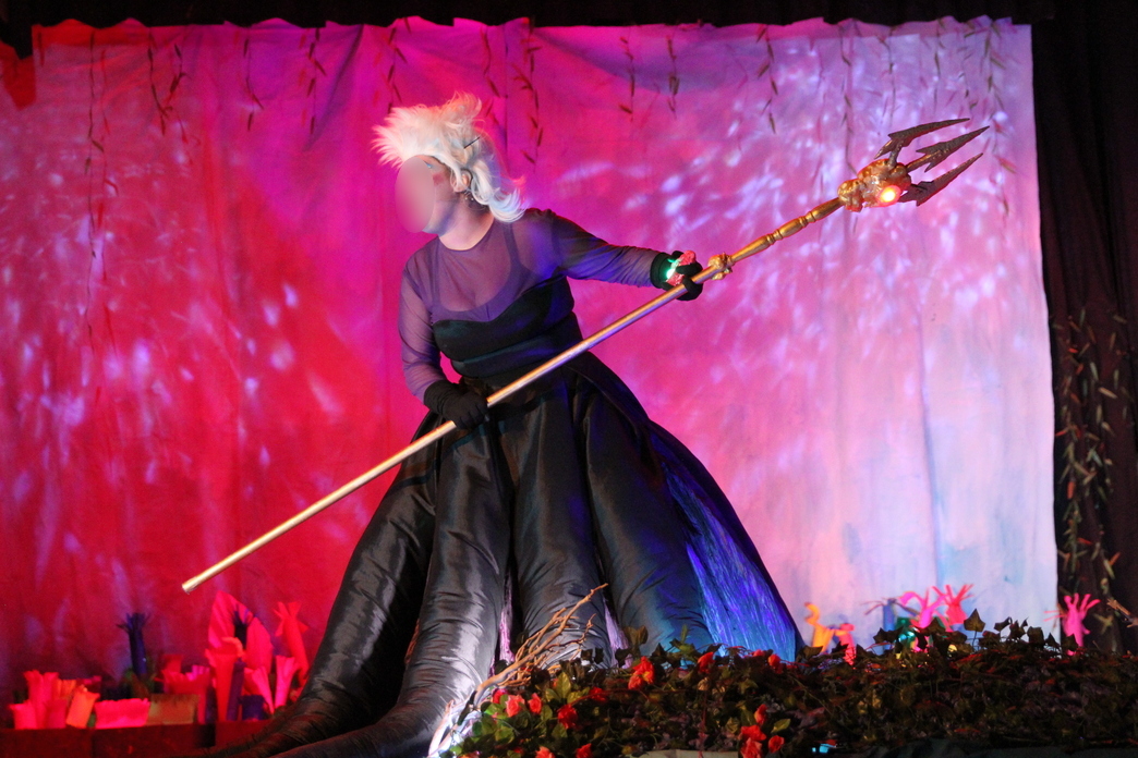 Other than Ursula, the costumes that got the most “buzz” were the fish heads I made for the ensemble. I happened upon a discontinued fish costume pattern and I went to town. The only money I spent on these fish was for the foam base under the fabric and the pattern itself. Otherwise, we had fun going through our stash and finding lots of fabric that looked “fish-like” to us. I then proceeded to fight with the craft foam and the various elements of the fish for the next couple of weeks!