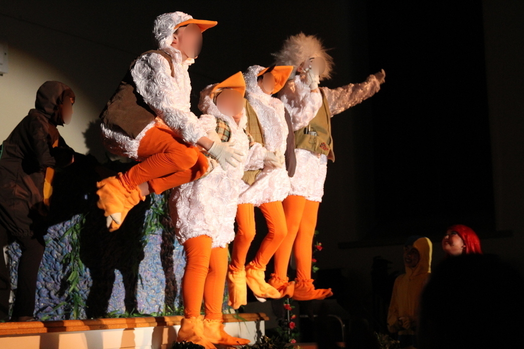 One issue we had with the fish heads was that some of the girls playing the fish were very small, and despite how tight the straps were, they kept falling off the back of their heads. This problem was solved by gluing baseball caps into the heads. It worked perfectly! The fish heads stayed put even with the dance number in “Under the Sea.” The costume was finished off with a bodysuit and a little tutu. Unfortunately it was almost impossible to get a photo of the kids in the costumes, so the fish themselves will have to do for visual image.