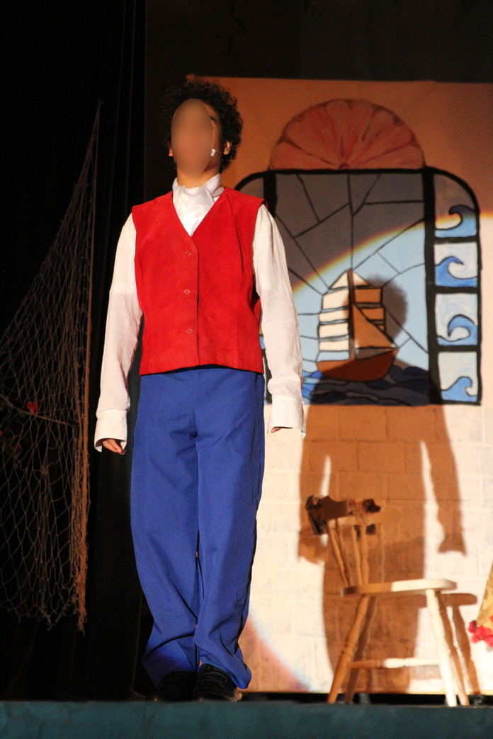 I actually put together three costumes for Eric. There was his “sea Eric” costume, which he wore when he was on his ship. Then there was his “land Eric” costume, which he wore in Act II when most of Eric’s action takes place on land as he finds Ariel and shows her around. I also had “wedding Eric,” which was a store bought Prince Charming costume so that he would look just a tad more royal for the wedding scene at the end.