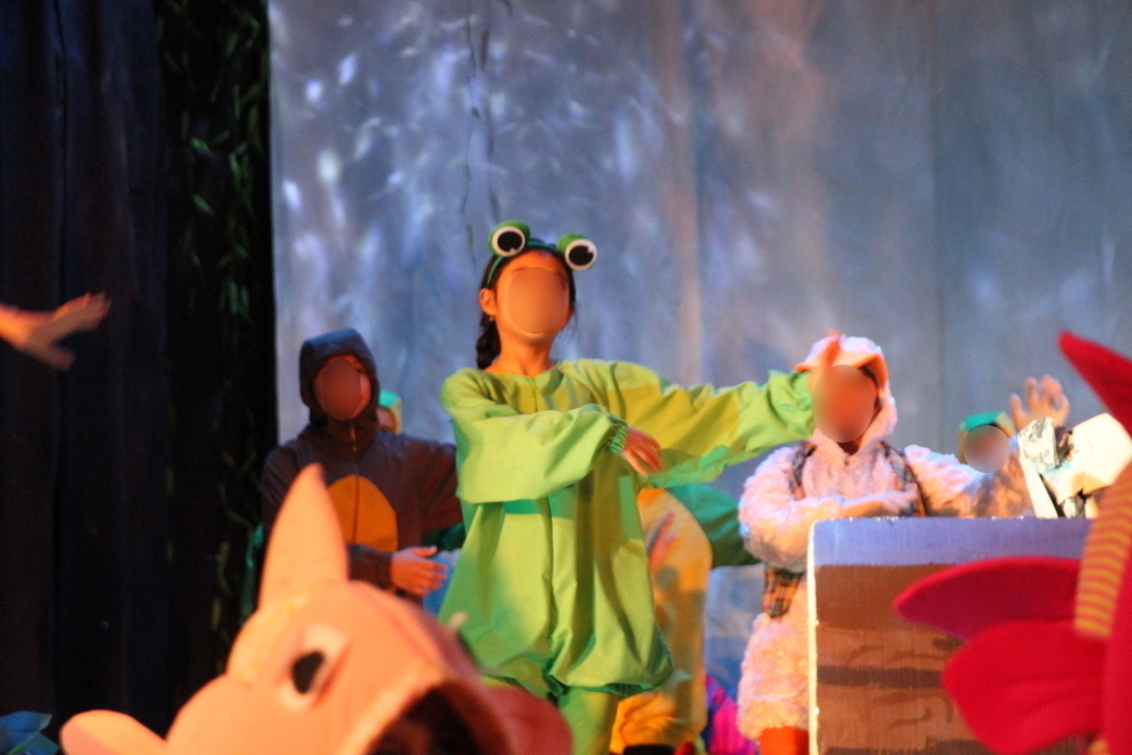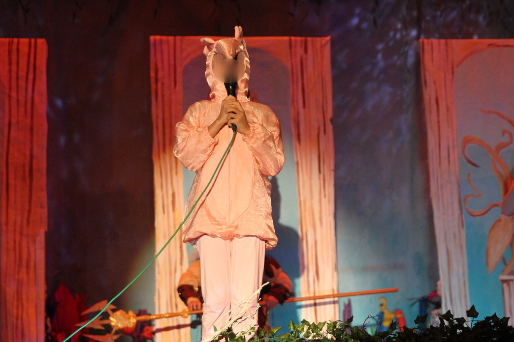 The lagoon animals were perhaps the most irritating project of the whole show. I decided that there would be frogs, turtles, ducks and flamingoes. I used the exact same hoodie pattern again – it turned out to be a fantastic all-purpose pattern! Each lagoon animal had a different color, or combination of colors to represent their specific character. Each also had their own specific characteristic beyond color: the turtles had shells made from fabric-covered aluminum pans from the grocery store, the frogs had frog eye headbands, the ducks had bills that I purchased, and the flamingoes had separate hood pieces with beaks. Though it was, at times, frustrating to deal with the sheer volume of the costumes, I did have fun piecing these together to give the scene the right effect.
