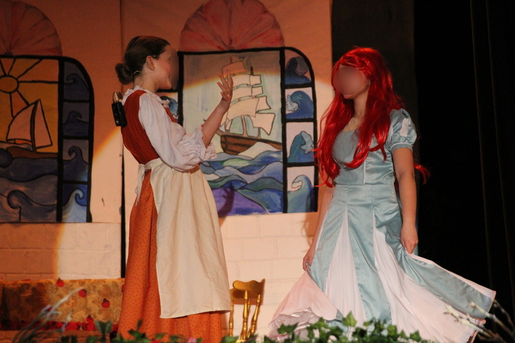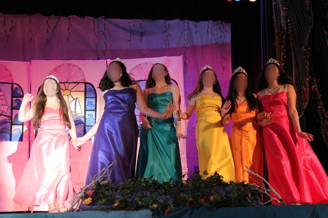 The princesses who vie for Prince Eric’s attention were played by the same girls who played the mersisters, at my request. There were six of each, so it made sense and I had a costuming idea that would make my life – and theirs – easier. For the princesses, they kept the same top on, and added a coordinating skirt that could be pulled on right over their mermaid tail if they wanted to. It allowed for a small amount of work on my part, and an easier costume change for them. Plus, I had fun deciding which color each girl’s dress would be.