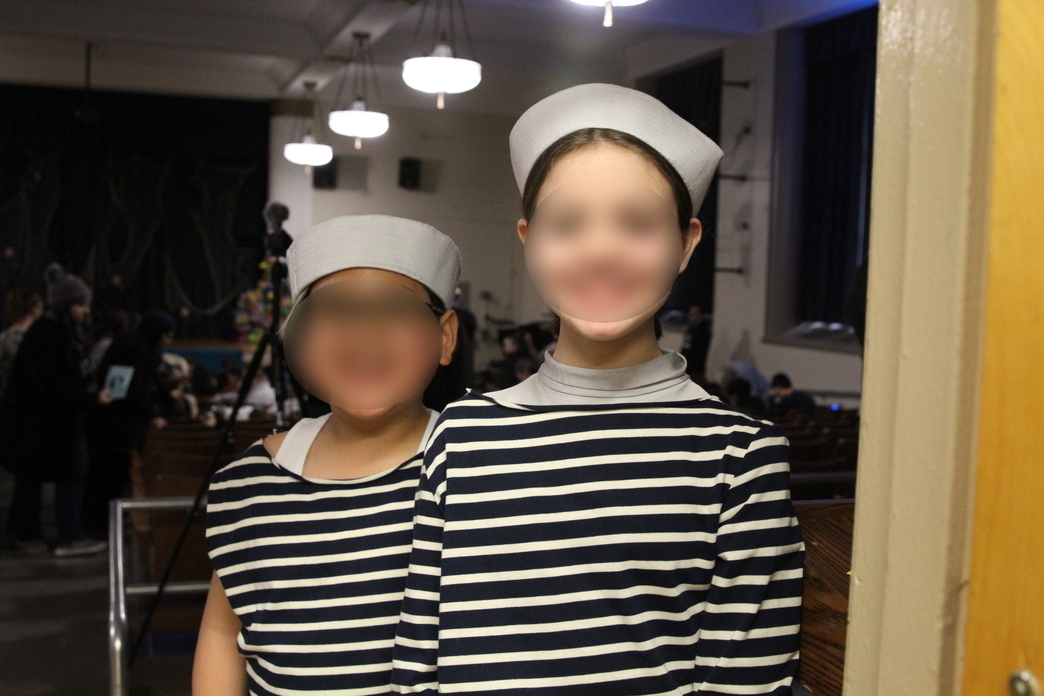 Last but not least, we have the sailors. There were a lot of them, but their costumes did not take a particularly long time. I used the Edie Top pattern from Sew Over It, and got some inexpensive striped knit fabric, and quickly whipped up the seventeen tops that we needed. For the bottoms, we bought sweatpants, and to top it all off, a sailor hat. Perhaps they were not the most authentic looking sailors in the world, but it did the job!