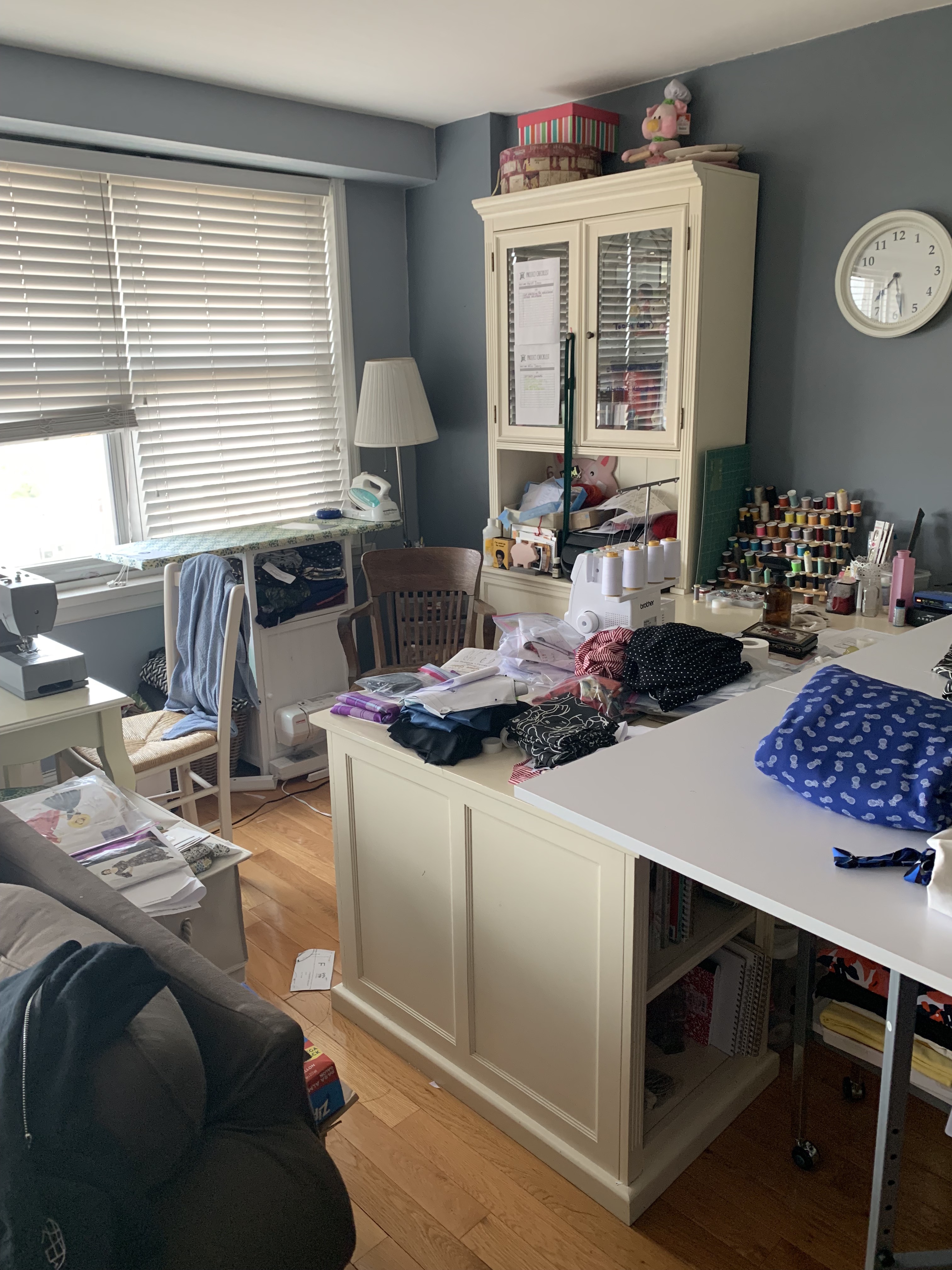 This spot right here is the only thing that I’m not planning to improve, other than some straightening up. It’s where I keep my thread and some notions (other notions are in a little portable tower next to the ironing board). This spot works well as it and is also a great place for the serger (which I have cleaned off since this picture was taken!).
