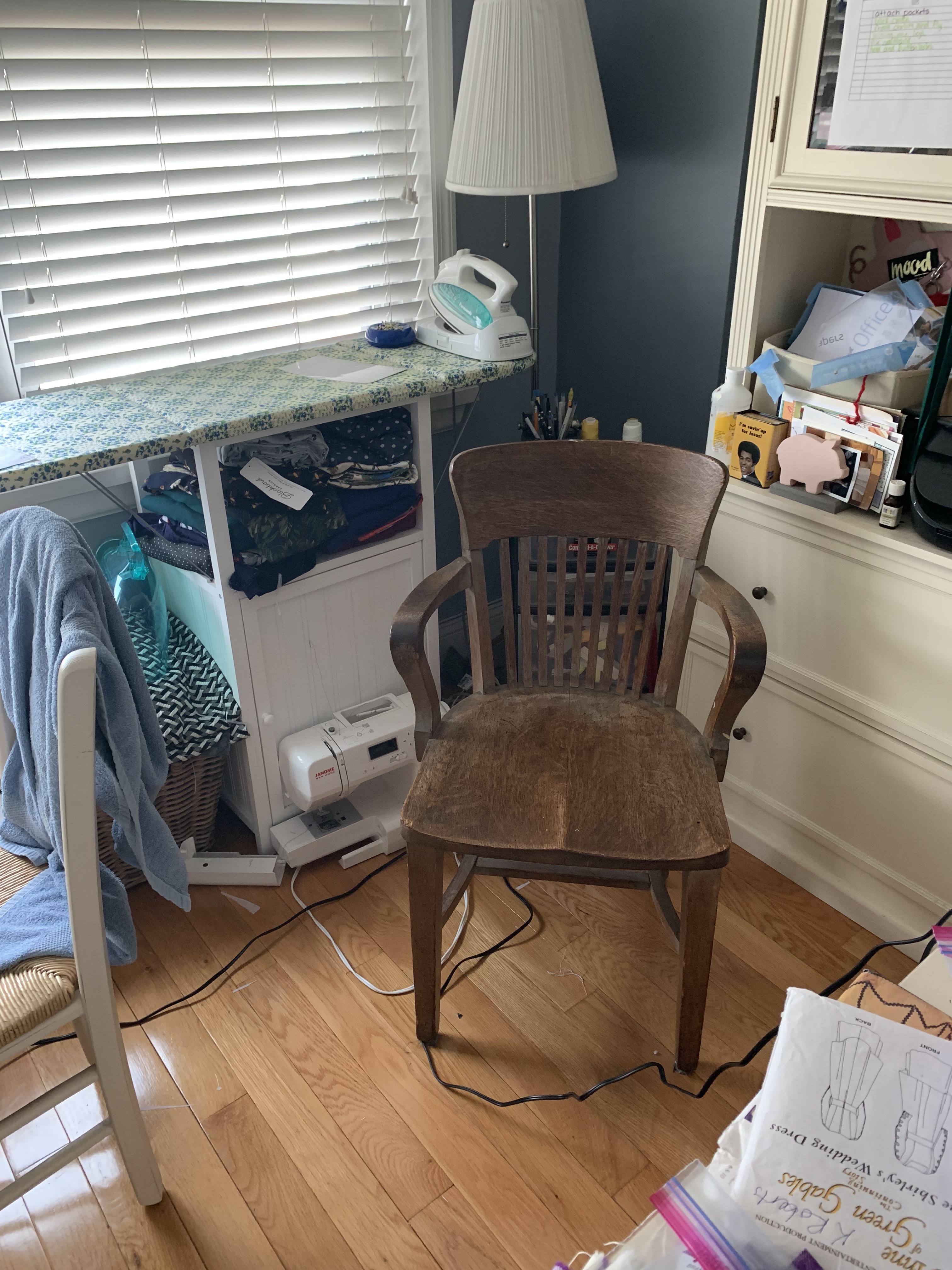 Here you see the ironing area, along with my still broken second sewing machine (one of these days I will get that to the repair shop!). This was my desk chair, and it’s just way too big for this little corner of my apartment. The ironing table is a relatively new addition and it’s great – fits right into the space and is much closer to my work now. I used to keep the ironing board on the dining room table and, while it wasn’t particularly far away, it definitely flows better to have the ironing station within the workspace.