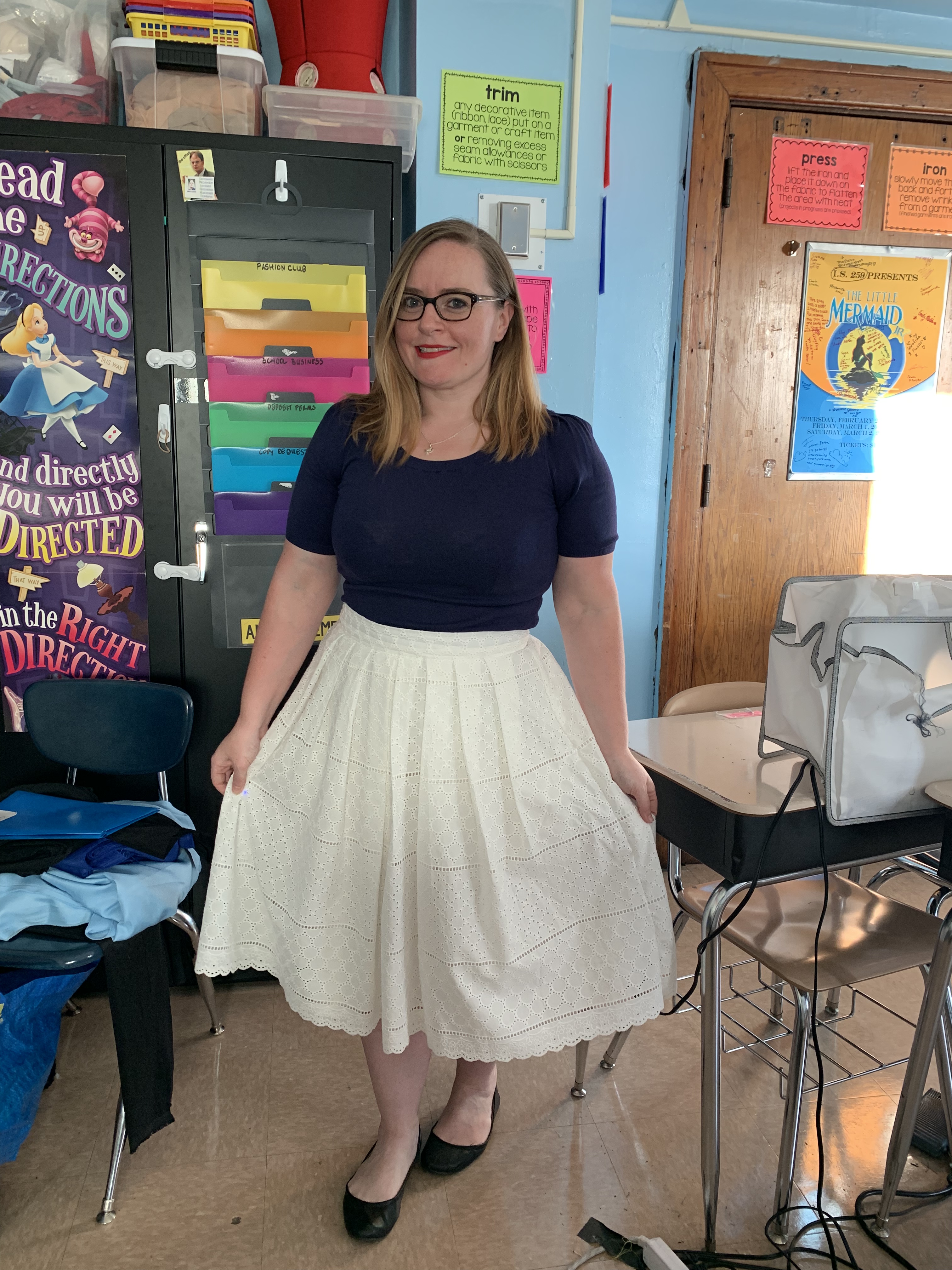 I have no idea why I don’t make more skirts! This was so easy, especially since I didn’t even need to hem it. I found the fabric on sale at Joann Fabrics over the summer and knew right away what it wanted to do with it. I knew the beautiful scalloped edge would work beautifully with a simple skirt, and I loved the eyelet. Plus, it was 60% off and I got three yards for just over the price of one!