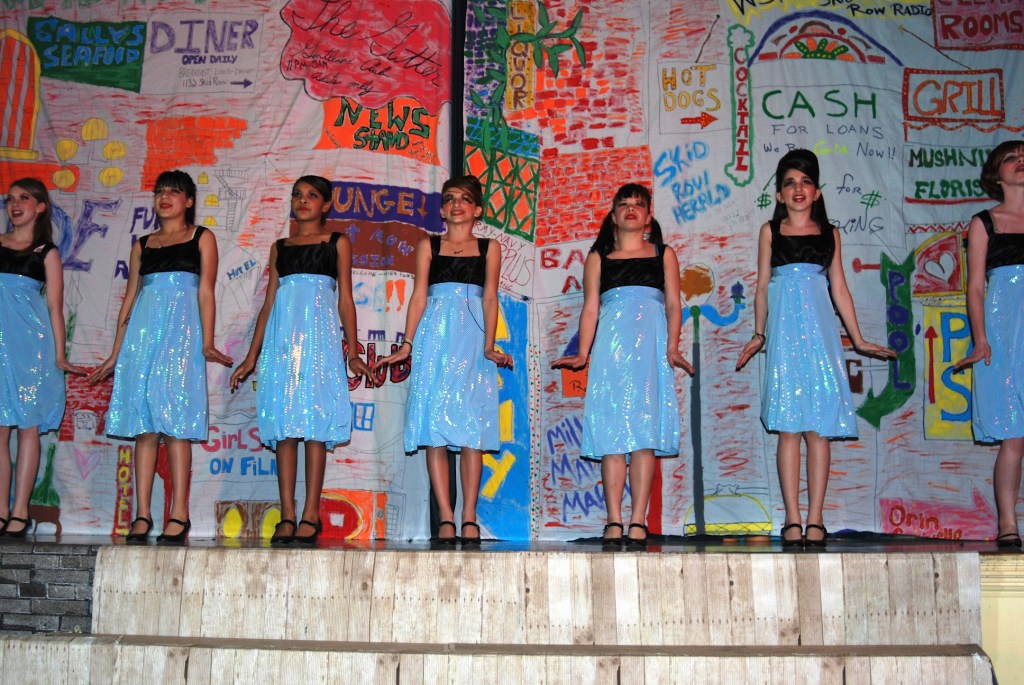 The solution was to make them a basic black dress with velcro sewn into the waist. Then they had skirt additions they would stick onto the velcro. Using this method, they had three different costume changes surrounding one dress. I was particularly proud of the ribbon versions they wore on the end (which I remember modeling after dresses I saw in That Thing You Do!). I cannot for the life of me find any pictures of their third skirt, which was basically just silver fringe, but here are the opening and closing numbers: