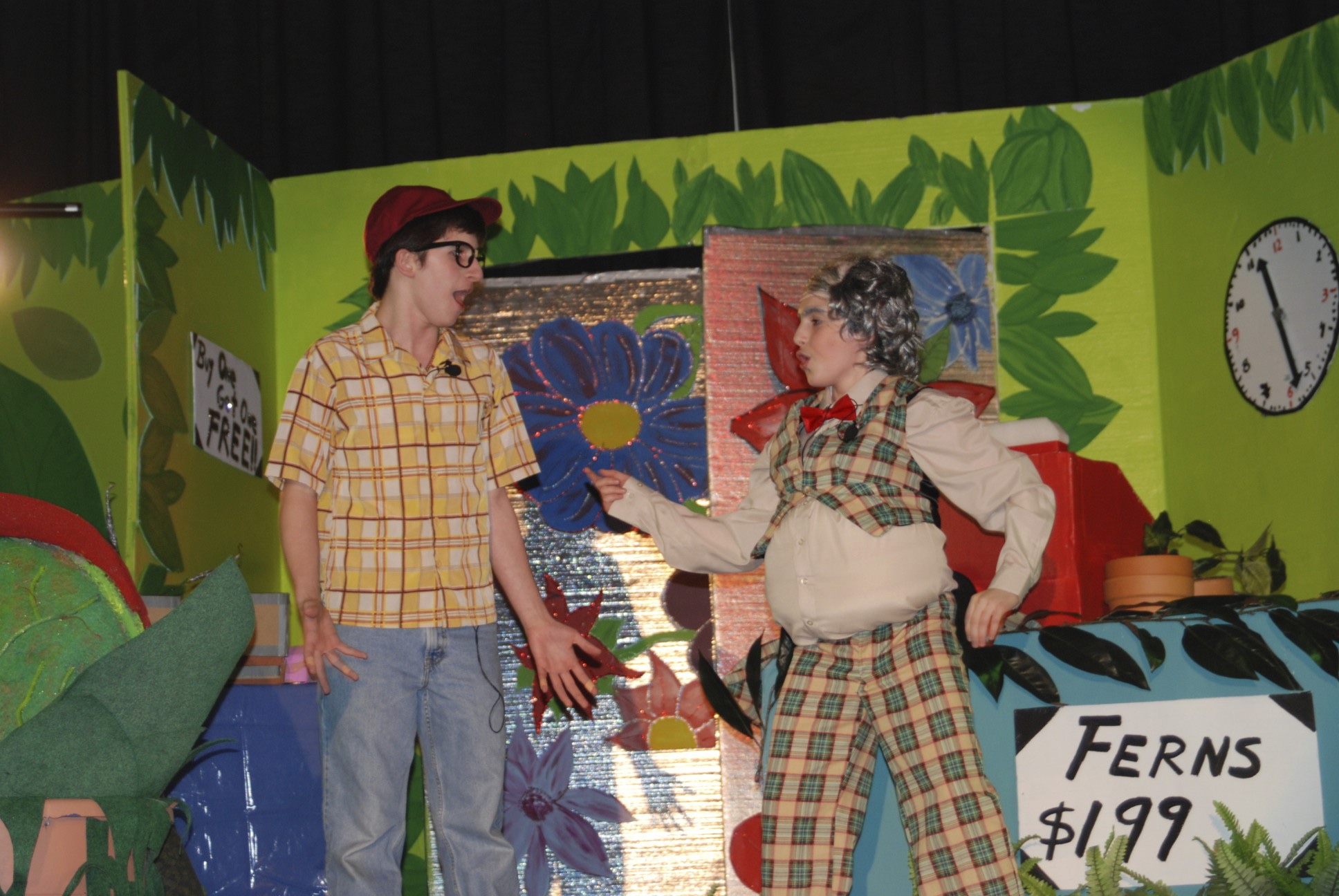 For the second act, I simple took away the glasses and gave Seymour a different plaid shirt. I will admit it was definitely more of a “phone it in” moment rather than a significant costuming decision. You can see the shirt in the photo above with Audrey in her wedding ribbon dress.