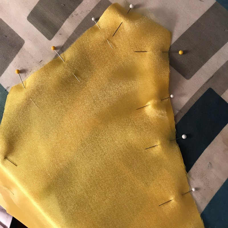 First up was sewing all the organza overlay to the satin. I decided to do it this way rather than use the satin as the lining so as to avoid unattractive seams (yes, I know French seams exist but I find this to be a cleaner look and it’s annoying/nearly impossible to do French seams on curves… or, at the very least, I don’t like doing it!). Pinning is always the most annoying part of the process as you want to make sure the organza doesn’t slip around on the equally slippery satin.