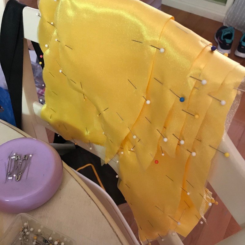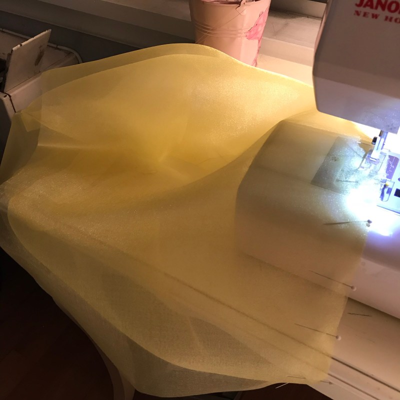 I finally had a full skirt put together, satin and organza layers! This was exciting because I got to see how the whole thing would eventually come together.