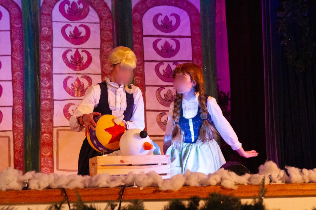 We also had a pretty cool Anna quick change during “For the First Time in Forever.” She starts the scene in a nightgown and about halfway through the song changes into her coronation dress! This is done in about twenty seconds by my absolutely stellar crew. Our Annas are already wearing the bodice of the costume under the nightgown, so they get into the skirt with the help of the costume crew and run right back out onstage. It’s frantic and crazy for the crew but looks absolutely flawless to the audience!