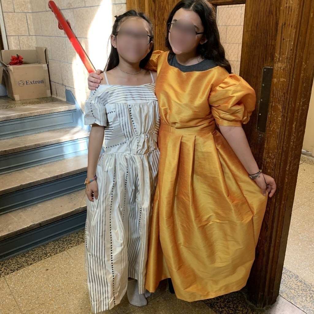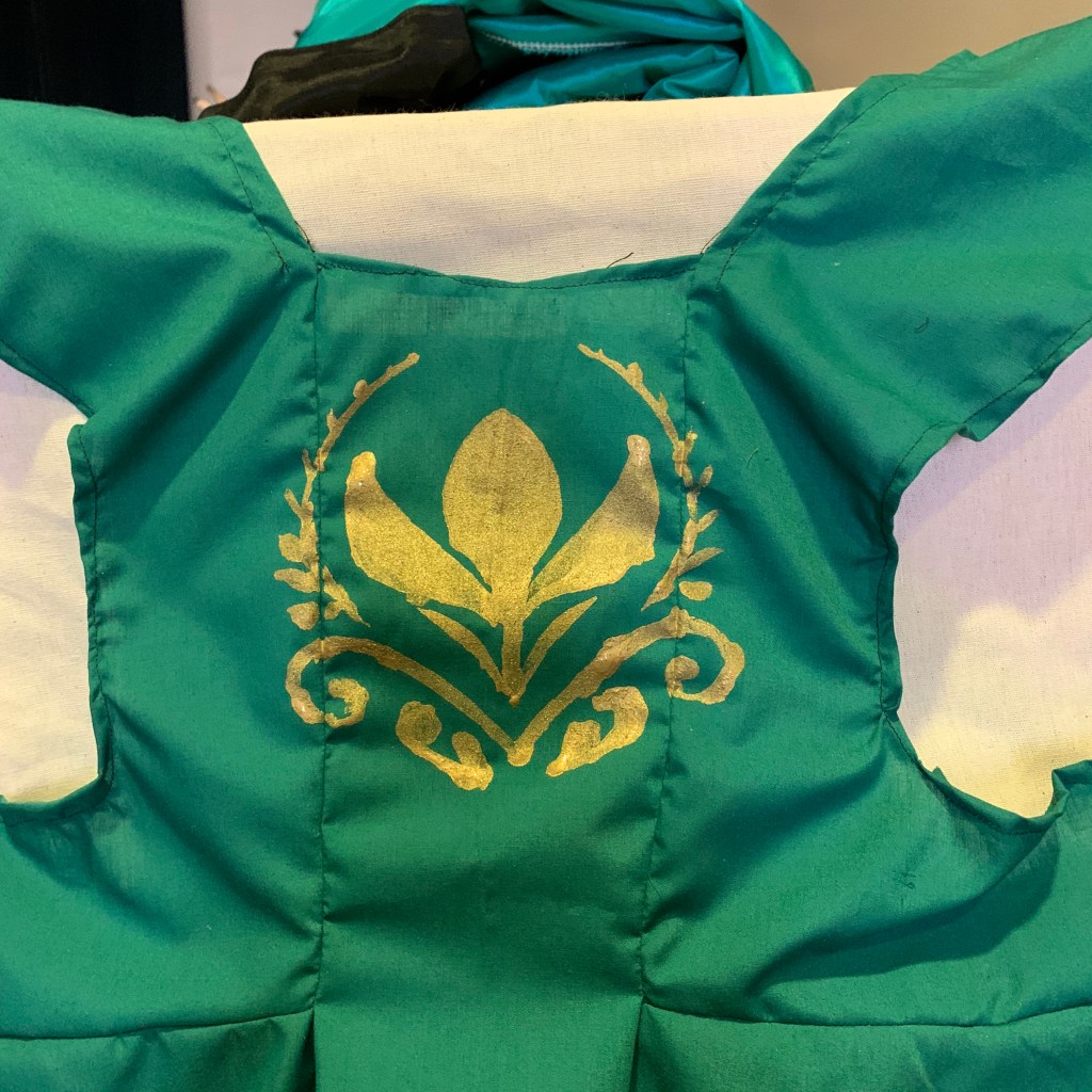 It’s often really hard to get a good picture of the ensemble, and it was particularly difficult for the fancy dresses as the ensemble is very much in the background of these scenes, but I found what I could (including a backstage picture from a rehearsal!). I used two basic patterns and scoured my classroom for anything that could look like a ballgown.