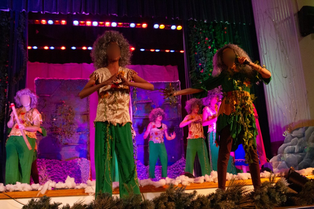 The Hidden Folk went through a lot of different versions before we finally settled on the little elven looking things we came up with. I have to admit, these were not my favorite costumes to make or design. I wanted them to be much cooler but in the end had to go with time and resources. All the female Hidden Folk got a dress with brown leggings. The boys got a pair of pants and a vest/shirt thing. All of them got decorated with nature elements. The costumes were ultimately topped off by crazy-looking wigs.