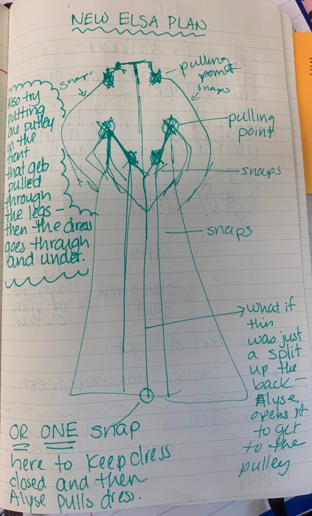 We’ll begin with the basic concept. Despite this being a middle school version of Frozen, we wanted to go all out with the transformation. We wanted that dress to disappear off of Elsa’s body at just the right moment. I started working on the plans MONTHS in advance. I had a solid idea well before we even held auditions.