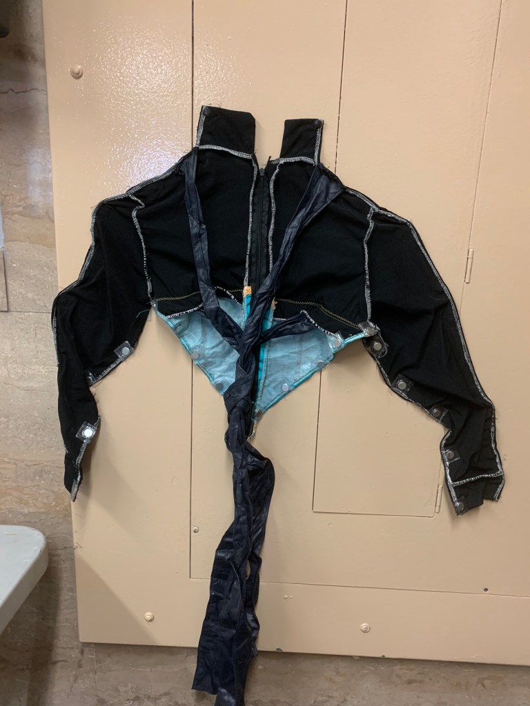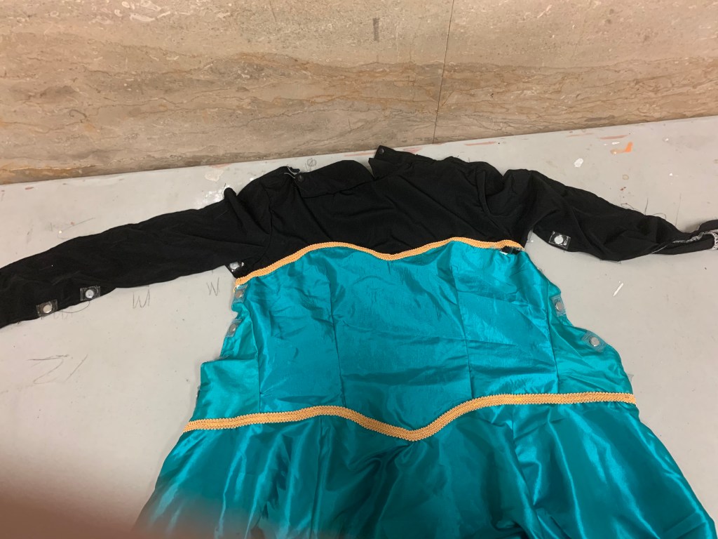 The non-transformation version and the transformation version would look almost identical to each other. I designed a simple version of what Elsa wears in the movie: turquoise and black. This was paired with a sweeping magenta satin cape. It also had Elsa’s signature gloves, which were purchased on Amazon. They’re actually fleece winter gloves, because the satin gloves we bought we too difficult to take on an off in a hurry, and that was something that needed to happen fairly often.