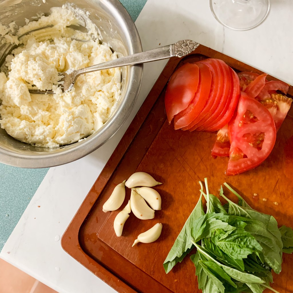 First off, the ingredients. Now, I don’t have any measurements here. I just kind of wing it every time. However, you need goat cheese, heavy cream, tomato, basil, garlic and bread.