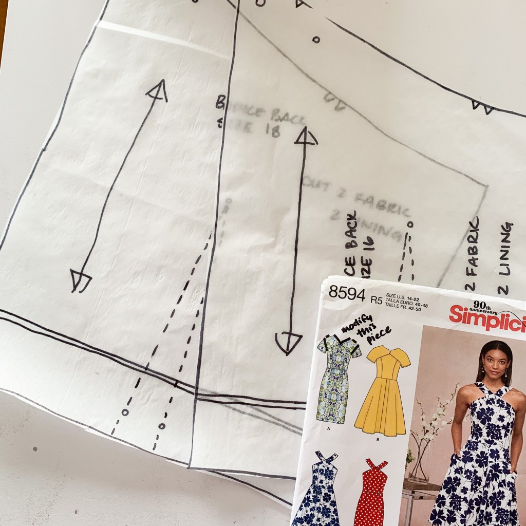 Then it was time to trace out the pattern pieces for the bodice. I used the above Simplicity pattern but knew I was going to modify the straps quite a bit. You can see my proposed plan on the line drawing in the upper left. It was also at this point that I decided to trace two sizes so I could figure out which one worked better for me.