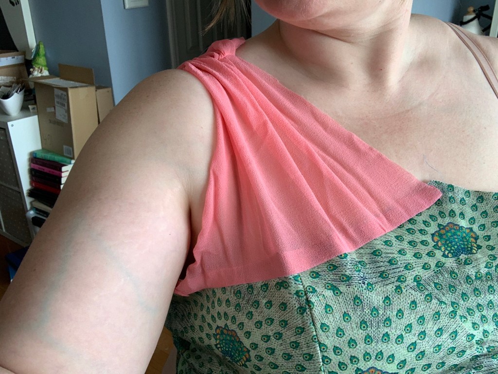 I put together a Muslim using some leftover stretch cotton I had, as it was a similar weight to the main project fabric. I manipulated the strap pieces (no pictures of that process) and got a decent mock up make. At this point I decided I wanted the straps to be a little narrower at the shoulder, so I went back in and modified the piece a little more.