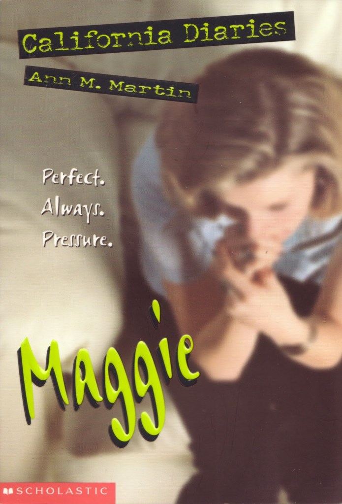 In the next of the California Diaries series, we have Maggie: Diary One. As with the first two books, this is told in bits and pieces from Maggie’s required journal, and we see Maggie dealing with the pressure to be perfect put on her by her father, and how she rebels against it. She ends up going against his wishes and joining a local band. Things get complicated when a movie premiere (her father is the producer) falls on the same night as a Battle of the Bands competition. Maggie does her best to attend both but of course ends up getting caught. Most of the CD books ends on a slightly cliff-hanger-esque note (not really a cliff-hanger, exactly, but they don’t wrap up everything in a little box like the regular series books).