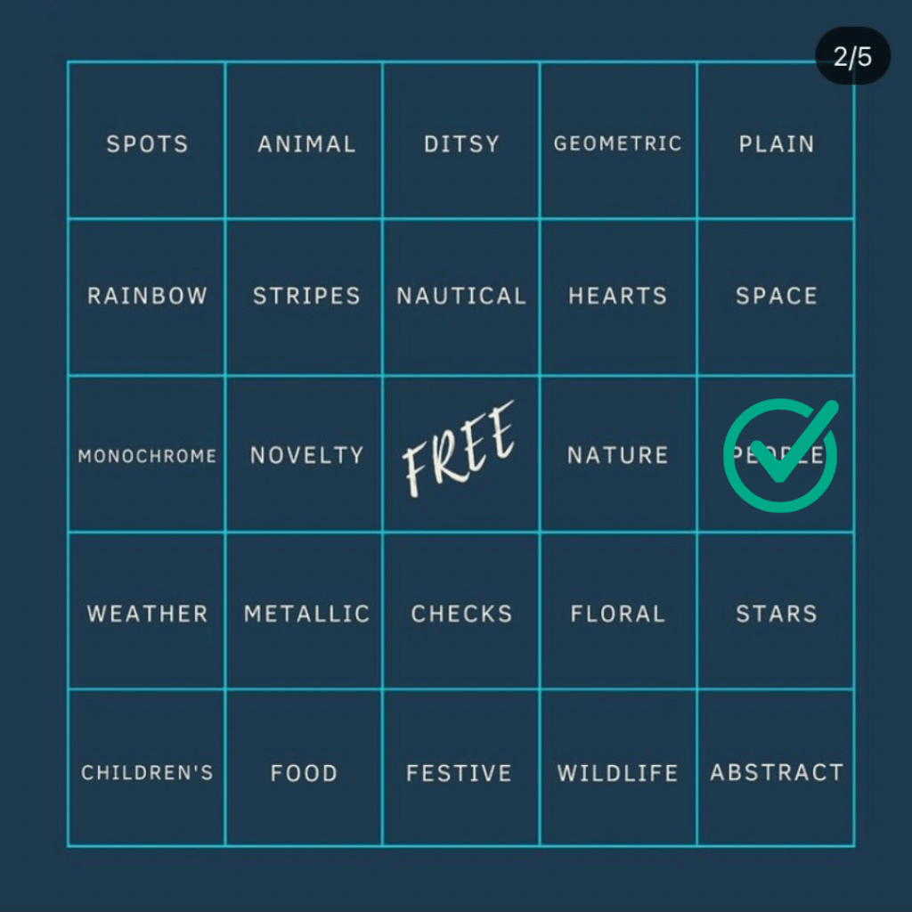 The next is #sewingprints2021, hosted by @romy.kate. This is a fun stash-busting challenge that works like a bingo board. The goal here for me is not necessarily to finish it, but to do as many as possible. This one was easy: it’s a print with people!