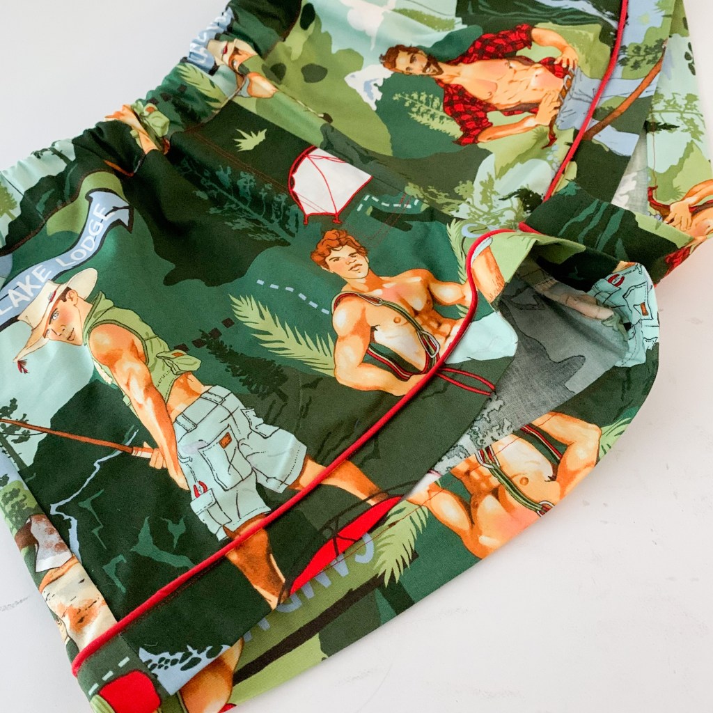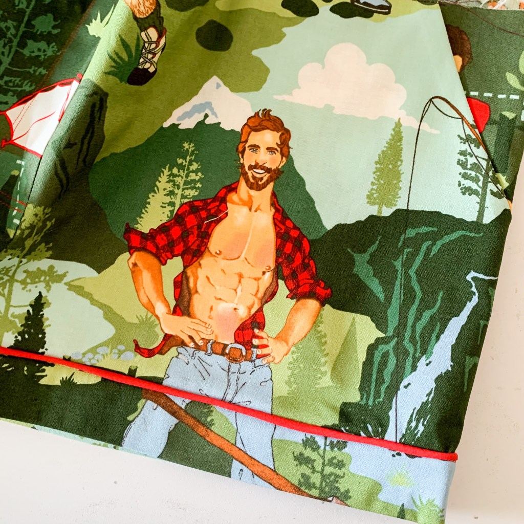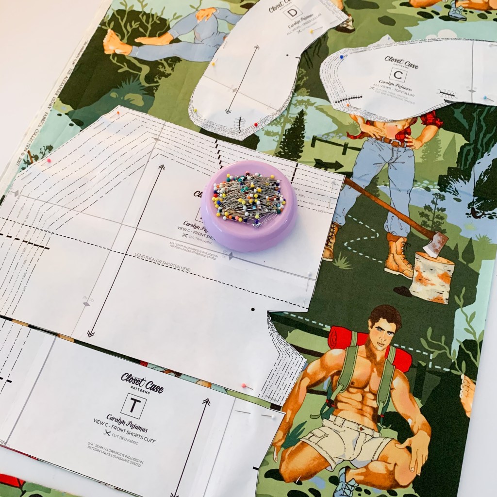 I can’t say why I chose the Carolyn Pajama Pattern from Closet Core Patterns as my first project of 2021, but I have been planning to make them for a while. I had the fabric all picked out: a ridiculous lumberjack/mountain main/camper fabric that I saw in the garment district in August 2019, regretted not buying and then tracked down on the internet. Turns out there’s a whole slew of “pin up” fabrics by Alexander Henry, and they are all super kitschy in the very best way possible. My initial idea for the fabric was a super girly dress to juxtapose the men, but then I realized that I couldn’t really ever wear it anywhere (you can’t wear this to work when you teach middle school!), so pajamas seemed like a much more practical idea.