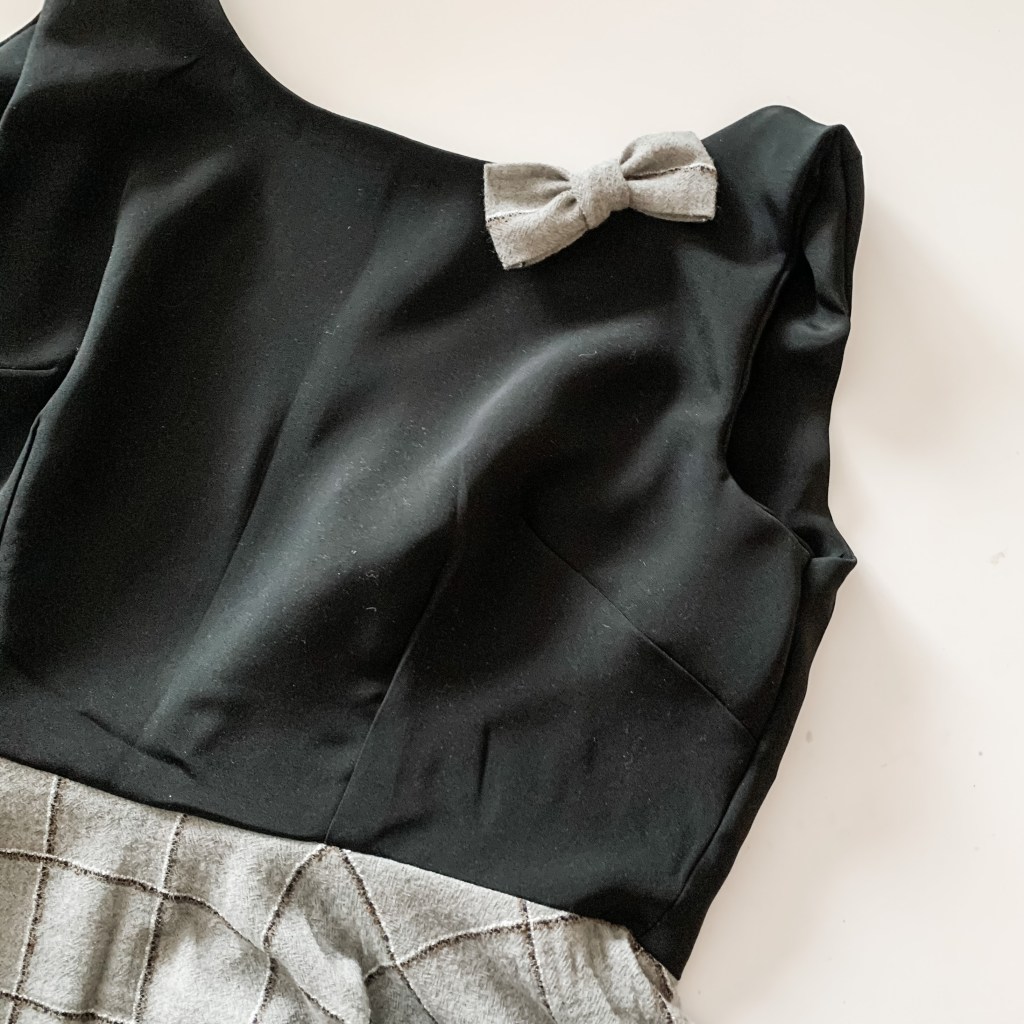 Once the dress was done, I felt like it needed a little extra something, so I took some of the extra gray fabric and made a little fabric bow to put along the neckline. It definitely gave the dress a boost of retro vibes, as well as tied the two fabrics together.