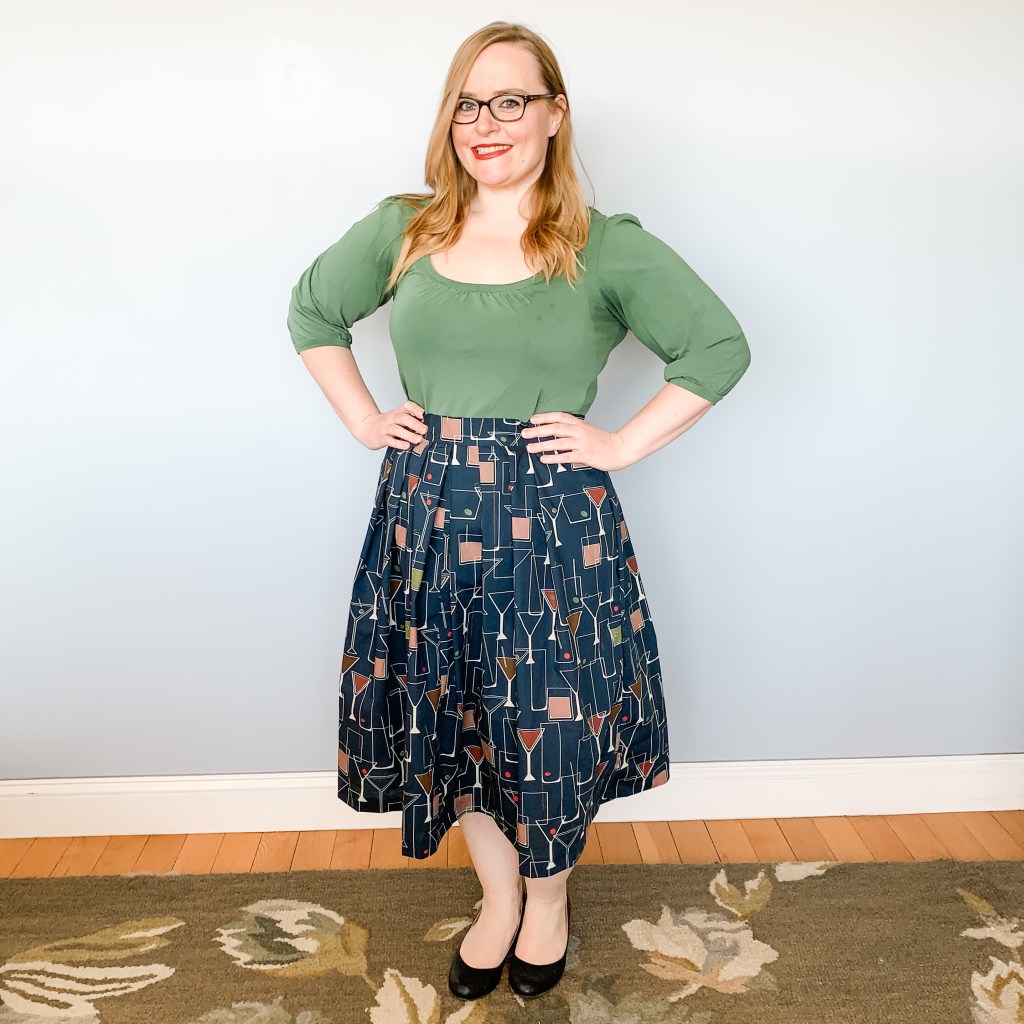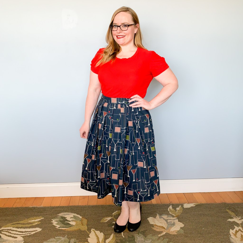 The final project I completed was another Sew Over It Lizzie Skirt. I love a Lizzie! It’s such a quick and easy project! I bought this adorable, quirky cocktail hour print fabric, and made quick work of it over the weekend, completing the hand sewing last week.